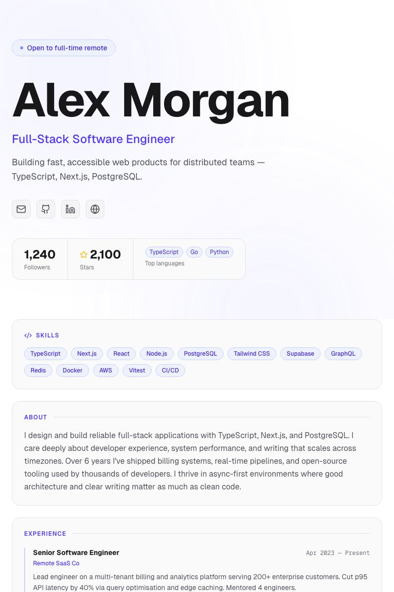 Your portfolio, your brand. No 'Built with RemoteWorks' footer.